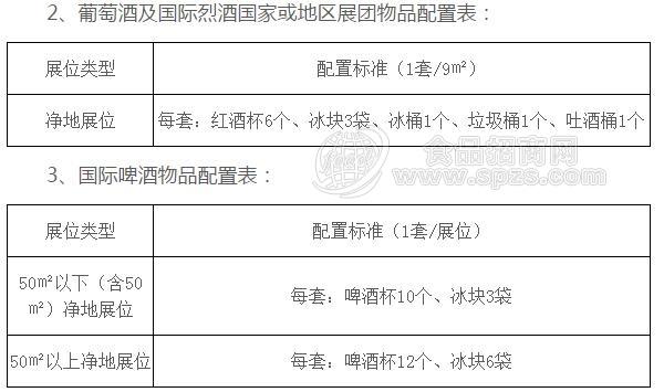 葡萄酒及国际烈酒展区、国际啤酒专区净地展位和标准展位均按下表分别免费配置酒具等相关物品: